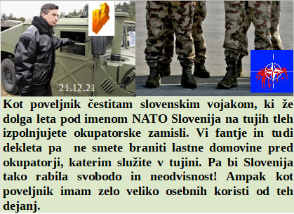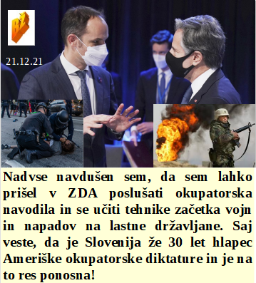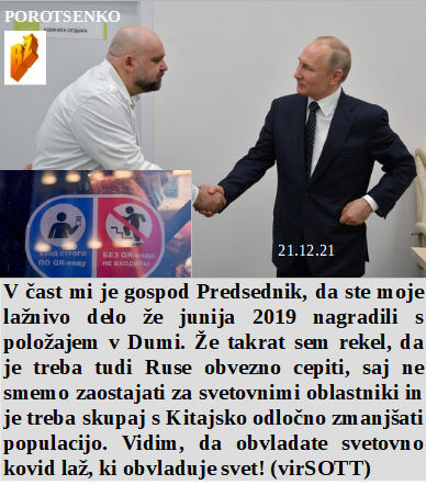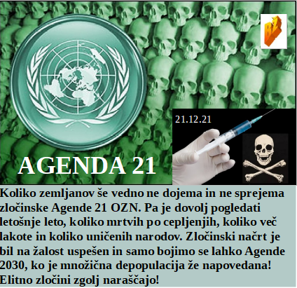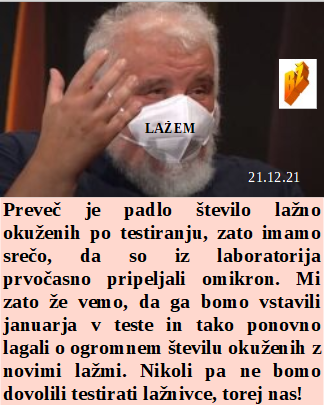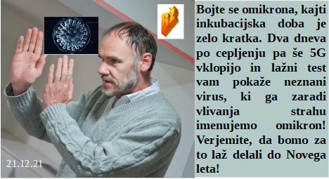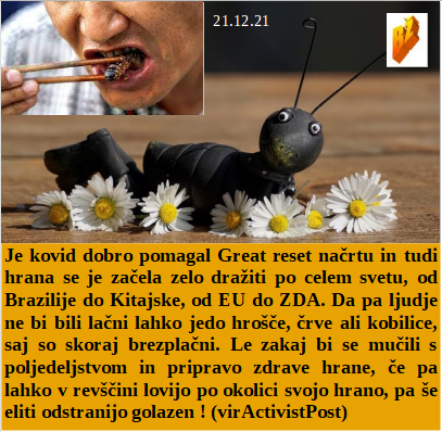 Bodo ščurki in črvi letos glavni na krožniku za Novo leto? Poučiti se o diktatorskem in okupatorskem odnosu do ljudstva je izjemno dobrodošlo. Zakaj pa Rusi ne bi bili cepljeni, saj je ta zločin namenjen celemu svetu, brez izjeme. Je začelo padati število lažno okuženih po testih, zato rabimo omikron. Čudoviti slovenski vojaki na okupatorskih NATO misijah v tujini. Omikron je nevaren, dva dneva in videli ga boste, v medijih. Je ljubljanski župan skoraj polovico toliko obdan s korupcijo kot mi vodilni v SDS! Končuje se leto 2021, torej zločinska Agenda 21.