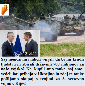 Smo ljudem pokradli 780 milijonov, da zdaj tanke vozimo v Ukrajino. Politika ali kovid, ista laž z istim namenom. V Argentini je inflacija naštudirano že 60% letos. Tudi Romuni in Črnogorci izjemno podpirajo izvolitev novega denarnega mogotca!