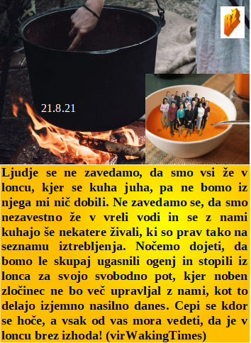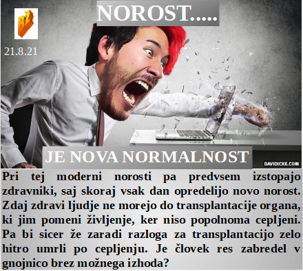 Svet je znorel, saj zdravi ne morejo do transplatacijskega organa, če niso cepljeni. Zakaj spomin na totalitarizme, če pa danes živimo v njem? Lonec se kuha, je poln, pa ne bo nič za ljudstvo. Roboti po cepljenju, ki so prej bili ljudje. Tako lahko nam je ponarediti testirano okužene, to delamo vsak dan. Maneken ali pridelovalec neužitnega sladkorja?