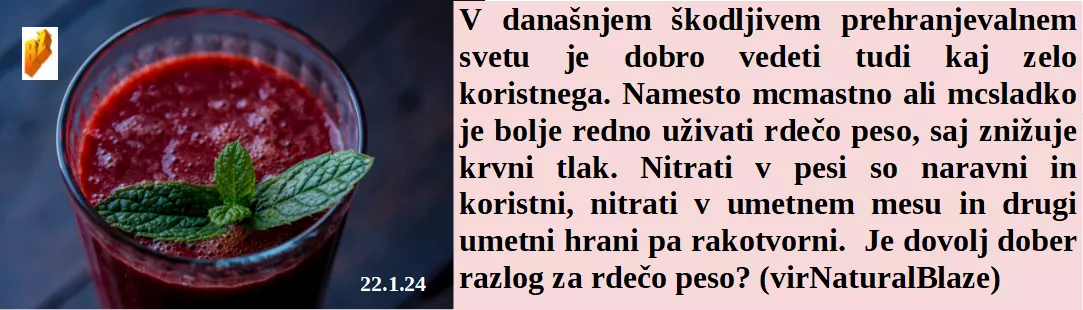 So EU ministri na veliko razlagali kako je ob snegu in mrazu zelena energija odlična. Po dveh dnevih dela na teden država še ni slišala za 5 tisočakov. In Netanjahu je svojemu narodu že odobril nakup umetnega mesa za uživanje. In vsaj ena dobra o koristih rdeče pese.
