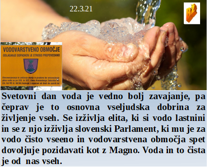 Voda je svetovna dobrina, namenjena ljudem in njihovemu zdravemu življenju, a imamo poleg lačne elite tudi pokvarjene slovenske poslance. Če si odlično plačan, potem je tudi smrtnosono cepivo 100% zanesljivo. Covid ne obstaja kar pokažejo polne gostinske terase. Amerika pa doživi celo človeško obnašanje policajev!!