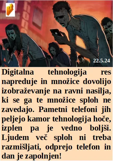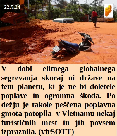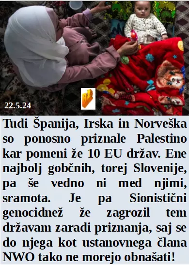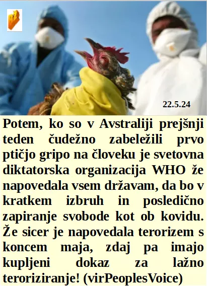 Vsaj v eni stvari je že več EU držav na pozitivni strani - Palestini. Eden drugega pljuvata, pa sta oba na tretjem rajhu. Digitalna tehnologija pospešeno pelje vse v propad. Kako veliko je v dobi lažnega segrevanja poplav in okoljskih katastrof. Po prvem primeru ptičje gripe WHO že grozi svetu.