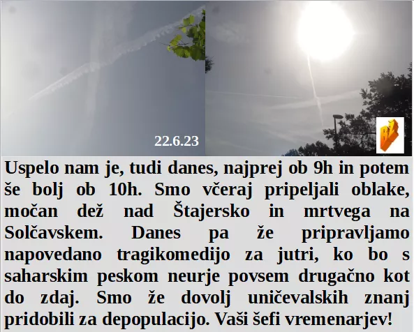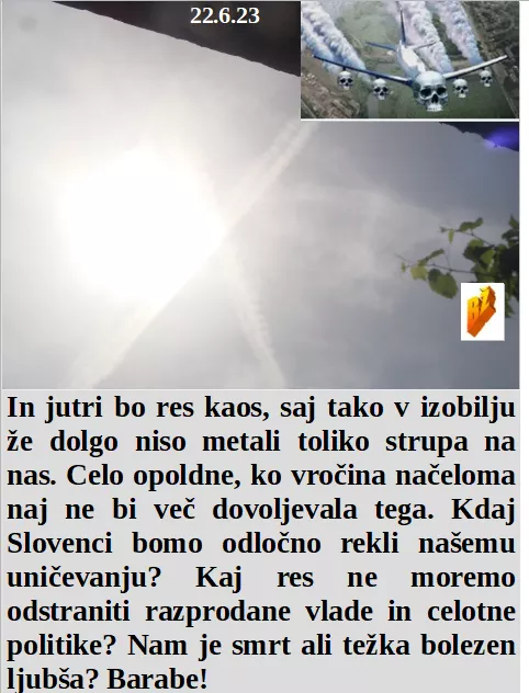 Če hočemo uspešen in poguben dež moramo najprej nebo pobarvati. Tudi v Slovenskih medijih navdušenje, ker so Američani odobrili umetno meso. Se znamo in hočemo Slovenci upreti zastrupljanju z neba? Jim je čez lužo verjetno ušel seznam novinarjev, ki delajo samo za lastno denarno zabavo. Kako zlobno je ukrepati proti zdravilni konoplji!
