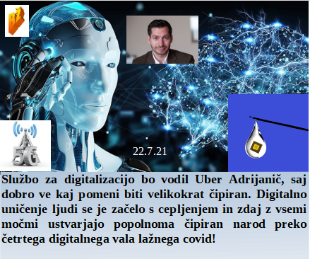 Voditi digitalno ministrstvo pomeni obvladati 5G. Amerika za necepljene že uvaja taborišča. Cepivo ni eksperimentalno, saj dokazujejo to številne smrti po cepljenju. Kanada pa se je že odločila, da nihče ne bo prišel več k njim, če bo zdrav! Strokovno vemo, da je pri nas še vedno 850.000 zdravih, zato jih je treba čimprej cepiti za 5G!