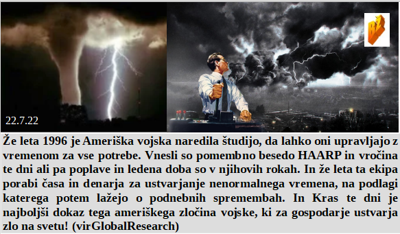 Kras več ne doživlja naravnih nesrečnih dogodkov ampak vse naštudirano! In Rusi nas več ne marajo, ker smo postali prozahodni izdajalci. Kdaj bo tudi svet dojel, da jim veliki mediji širijo zgolj ogabne laži? HAARP je vpeljan leta 1996 in danes je to hudičevo orožje. Kako pomembno je, da se zberete in odločno rečete - nikoli več se ne cepim!