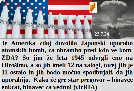 Smo vojaško zaljubljeni in bomo sledili vsakogar, ki mu je orožje zlato. Nekoč smo praznovali ta dan kot dan upora, žal samo nekoč. Nekateri moški so večno zaljubljeni, kljub demenci. Tudi Indija gre v digitalni nadzor nad narodom. Bo zdaj Japonska lahko uporabila Ameriško atomsko bombo iz Hirošime.