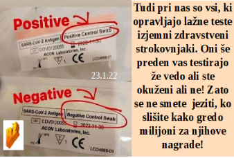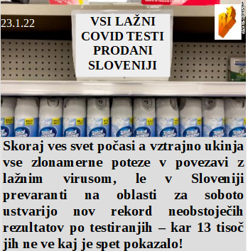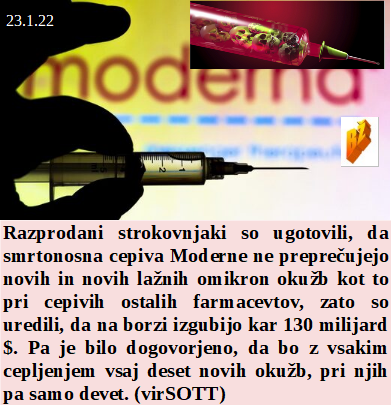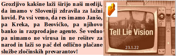 Je Slovenija odličen kupec, saj je kupila že vse lažne teste. Zdravstveni strokovnjaki so pri nas izjemni, saj pred testiranjem že vedo ali ste pozitivni ali ne. In virusa še vedno ni čeprav je strahu razmetanega na tone. Slovenski prevod TV pa je - povej lažne vizije! Je Moderna na borzi izgubila milijarde, pa se drži lažnih cepiv kot slepi človek plota!