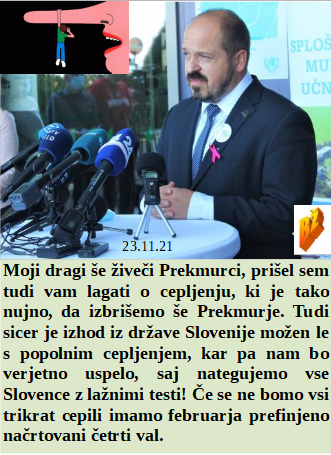Kako pomembno je, da so klovnčki ob meni, ko javno širim zlobo. Če nimaš Rolls Roysea že doma je težko primerjati smrtonosna cepiva z njim. Če ne bi bilo protestnikov že davno ne bi bilo kovida, to vam osebno jamčim. Nikoli si nisem mislil, da bom svojo otroško izjemno neumnost tako uspešno prenesel tudi v politiko. Ne more biti Prekmurje izjema pri iztrebljanju, zato vas bomo cepili!