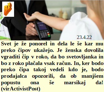 Koliko nas še dela čaka, da bo beseda laž v medijih, zdravstvu in šolstvu končno izginila. Bomo Ljubljančani uživali v plinu po dvojni ceni! Hrane je na tem planetu preveč, zato je treba stotine tovarn za pridelavo prehrane zažgati, to Američani obvladajo. Ko pa ti cepilni čip začne dobro delati, lahko tudi z roko plačaš in brez glave hodiš okoli!