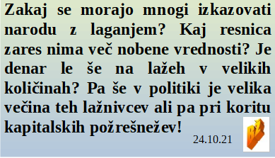Vsak dan so hujša laganja o okuženih, pa množice že vedo, da tega testi ne pokažejo! Pa menda niste mislili, da je ljubljanski maraton res ljubljanski? Kanada je že tam, necepljeni so postali nič vredna manjšina. Kdaj bo Bidenov dom zares ograjen? Kako to, da ima danes laž mnogo večjo moč kot resnica?