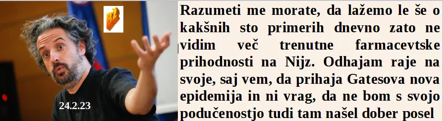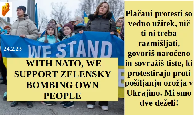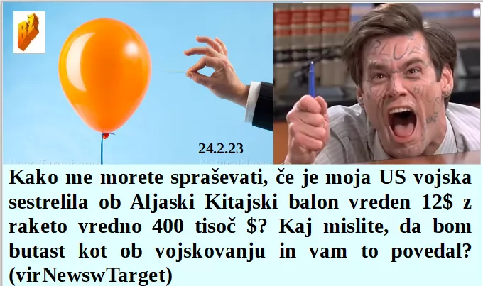 Hvala, da si se na pamet naučil moj napisani govor ob prvi obletnici Ukrajine. Biti med najvišjimi v OZN je pa ja laganja vreden privilegij. Je pa ja bilo vredno 400 tisoč $ vredno raketo uporabiti za ta Kitajski balon. Težki časi prihajajo, premalo lahko lažemo, zato grem na boljše mesto. Protestiramo proti pameti, smo za NATO in pobijanje svojih domorodnih.