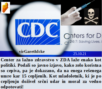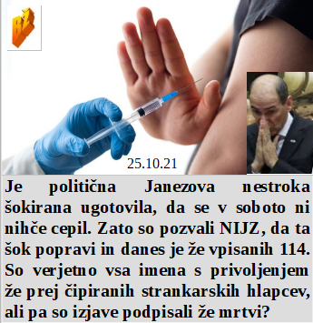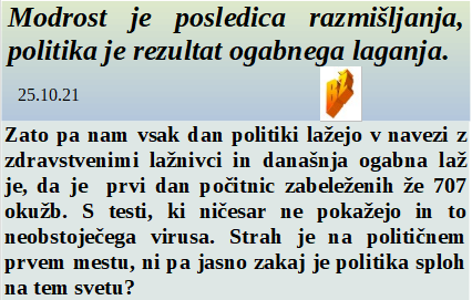 Sladkor na strup in politika se lahko veselo in ponosno sonči pred ljudstvom. Kako koristna so cepiva, če z njim enega rešijo 15 pa jih umre? Modrost nima kaj iskati v politiki, saj tam nihče ne razmišlja. V soboto ni bilo nikogar, ki bi se cepil, torej čaka vlado ogromno laganja, da preidejo na panično cepljenje