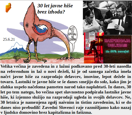 In kakšno je vaše mnenje o javni hiši po 30 letih? Vedno isti nas učijo o prebujanju, da bomo za vedno spali na njihovih lažeh. Mi smo po 30 letih pokazali, da smo pravi borci, nič za narod. Tudi na Nemškem Brniškem letališču so z letalskim barvanjem praznovali 30 let našega natega. Na Prešernovem trgu v Ljubljani pa množice, saj so slavile Jazenov novi Dob. RTV desničar je z desnim predsednikom razpravljal o 30 letni desničarski Sloveniji.
