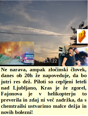 Narava nima več pojma kakšno vreme naj bi prišlo, za to odloča zločinski človek. Se opičje koze dogovarjajo le še o zločinih, le ena na sladoledu! Tudi Angleška vlada ponuja kmetom drobiž, da ukinejo pridelavo hrane. Milijarde se zasebno pretakajo v Ukrajinski vojni. In v deželi mora biti res nora vlada, da pri 40C uvede obvezne maske. Množice se še ne zavedajo kaj iz njih načrtno dela 5G sistem.