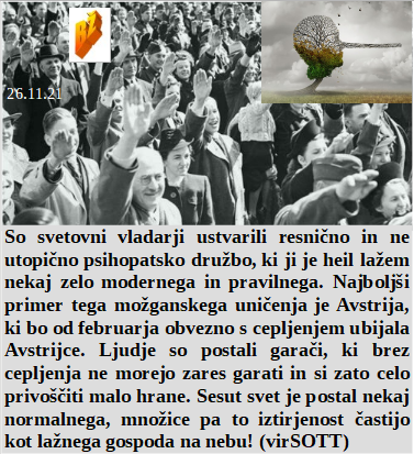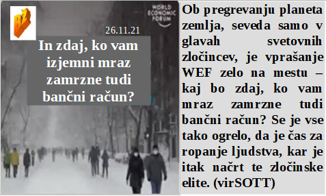 Pregreta zemlja bo zdaj po naročilu WEF zamrznila še bančne račune. Laboratorijski omicron je prišel zaradi denarcev skozi smrtonosna cepiva in medijskega ustvarjanja strahu. Heil bo od februarja obvezno ubijal vse Avstrijce. Janez pa polaga cvetje na grobove izdajalcev in domobrancev!