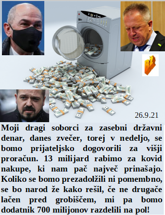 Nov državni proračun je prelepa priložnost za polnjenje lastnih političnih žepov. Je Nizozemska ministrica predlagala takojšnjo ukinitev kovid potnih listov, pa jo je šef takoj nagnal iz Vladne hiše. So trgovci priložili svoje milijone za gradnjo neskončnega števila 5G stolpov, saj imajo preveč kupcev. Cepljenje proti lažnemu kovid je zločin stoletja!