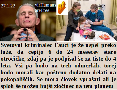Jutri vaših otrok že nakaj časa močno gori. Holokavst se nadaljuje, zgolj v drugačnih oblikah. Omikron bolniške sobe so polne, čeprav nikjer nikogar. Svetovni morilec je že dosegel, da bodo čez lužo nasilno cepili celo 6 do 24 mesecev stare! In Lek je rekel - kaj me briga, če ste me vi naredili, jaz sem tukaj le za denar tujcem!