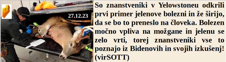 Se bomo električarji obesili na nove pokojnine in plače, ki jih določa naša Vlada. Sem pri prijateljih naročal epidemično blago pa zato simbolična kazen tisočak. Vam zagotavljam, da bomo segeravnje uredili in bo milijarda beguncev zato pri vas. So v Yellowstone parku odkrili prvo jelenovo bolezen za paniko.