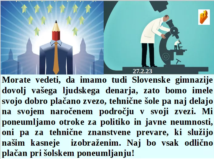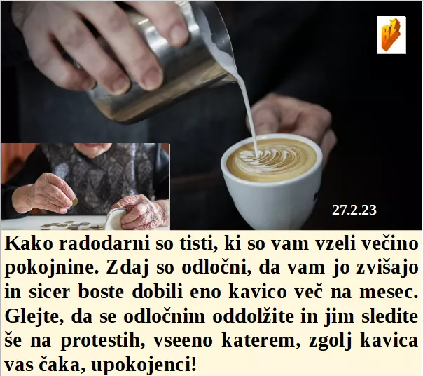 Pada nam zaupanje pa ne vemo zakaj, saj smo vendar tako diktatorski in proti vam! V gimnazijah imamo dovolj vašega denarja, torej gremo na svoje poneumljati vaše otroke. Mi smo zeleni, smo napredni, obožujemo Fukušimo, torej atomske centrale. In upokojenci bodo eno jutro v nebesih, lahko bodo spili eno kavico!