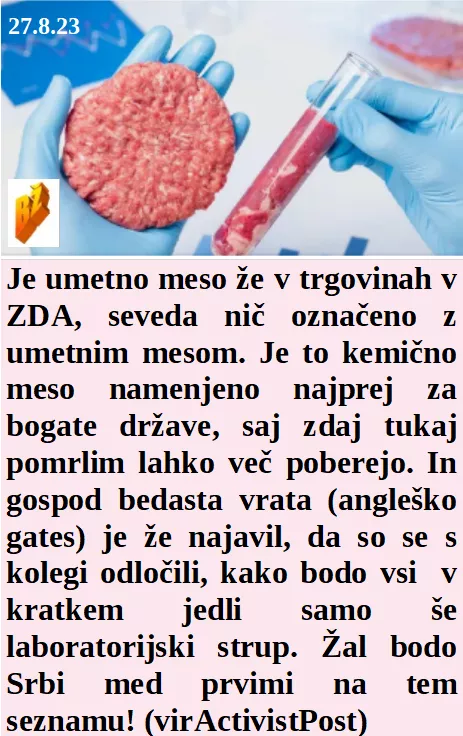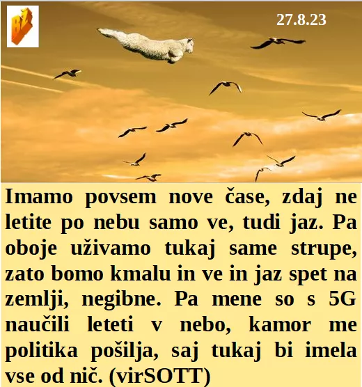 Za 5G šolsko poneumljanje je dovolj denarja, za revščino in zdravi pamet pač ne. Množice naivnih mislijo, da živimo za svobodo, svobode pa ni. In metanje strupov na množice nikoli ni težava. So tudi ovce začele z dovoljenjem leteti s pticami! Je umetno meso že v prodaji, kmalu tudi pri naših daljnih sosedih!