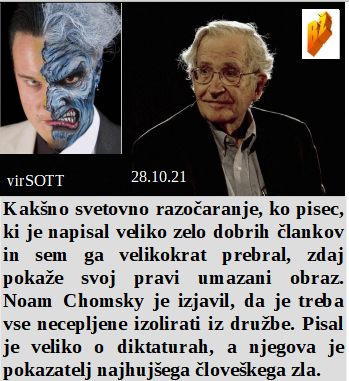 Ko že misliš, da so vsaj nekateri pošteni in resnicoljubni, pa se najde Noam. So Danci po izjemni precepljenosti spet zdrveli v novo genocidno politiko cepljenja. Smo 30 let mislili, da že imamo svoj potni list. Cepjenja zmanjšujejo možnosti presaditve organov. Vsaka vojna ima prikrita grobišča, sedanja 3. svetovna vojna ima kovid prikrita grobišča. In slovenski oblastniki veselo in zase še naprej razprodajajo državo.