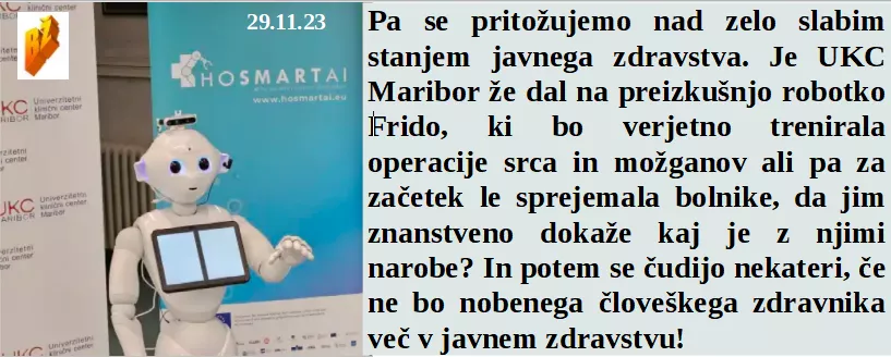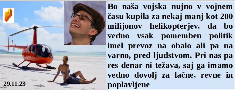 Smo se nekoč družno veselili, dokler niso prišli nepravi politiki. Naša vojska nujno rabi nove milijonske helikopterje za na plažo. Kot najboljši Slovenski maneken vem da gre vse brez mene le v potop. In bliža se redno javno zdravstvo, prve robotke so že tukaj.