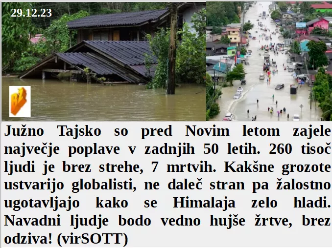 Samo še farmacevti in bolnišnice prenašajo gripe, za profit in paniko. Je tudi Ukrajina že dlje razdeljena na dva pola, za in proti Ukrajini. Nujno smo rabili 4 kolesne oklepnike saj vodimo mnoge vojne. In Južna Tajska je pred Novim letom doživela najhujše 50 letne poplave.