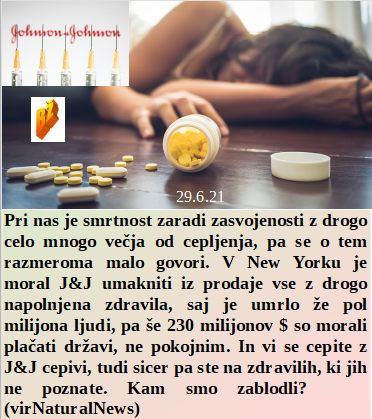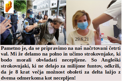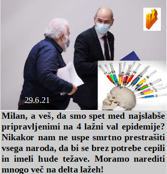 Kako na pamet je naučeno 30 letno laganje, od referenduma do cepljenja. In kakšna podobnost in ljubezen na daljavo med Janezom in Novo Zelandijo. Smo se pa dobro pripravili na boj proti nasprotnikom cepljenja, smo kupili 45 vojnih boxerjev. Dokazano od nepodkupljenih, da je 8 krat več možnosti zboleti za tehnološko izmišljeno delto po cepljenju! Tako slabo je naša vlada pripravljena, da še vedno ni 100% cepljenih norčkov. Ta hude droge tudi v lažnih zdravilih!