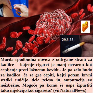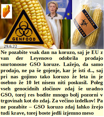 Je von der Leyenova ugotovila kako zdrava je GSO koruza, zato jo je hlapcem odobrila za kupovanje. Če po cepljeneju umre 750 tisoč ljudi in jih 5 milijonov postane delovno nesposobnih, boste zelo navdušeni? Tudi mi podpiramo širitev NATO in darovanje še več denarja, saj imamo še dosti ljudi, ki jih še nismo povsem pokradli. Ne bojte se uvedbe digitalnega denarja, saj boste še tisto malo izgubili za vedno! Od dveh slabih novic ena boljša - kajenje škodi mnogo manj kot cepljenje!