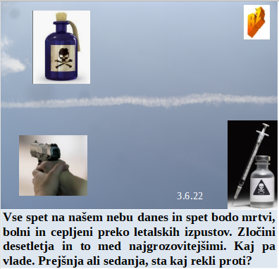 Je naše nebo že dolgo smrtonosno in verjemite, da se z novo vlado ne bo nič spremenilo. Pobiti vse živo na tem planetu in pograbiti vse njihovo. Kako huda in zgledna shujševalna za zdravje, če greš iz NIJZ v tovarno sladkorja delat. Avstralci bodo vsem študentom v 10 letih obvezno vgradili čipe v možgane. V Karačiju je Schwabu uspelo uničiti 40.000 tovarn!