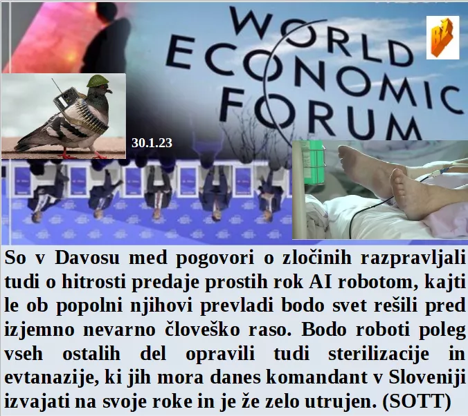 Kako zlobna je elita do tega sveta pokaže samo uničevanje kokošjih farm v ZDA. Je bil Davos posvečen tudi robotom, predvsem njihovemu prevzemu človeških delovnih rok. V Kraljevem objektu na Brdu smo razpravljali o sistemu uničenja pokojnin. Da bodo pravi dobili višje plače se bomo mi na narodove žepe dodatno zadolžili!