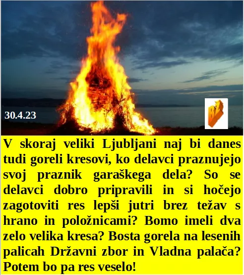 Tako množična prvomajska popotovanja pa toliko gospodarskih težav pred stečaji. Koliko jih je zadnjih 30 let zanosilo, pa mene ni bilo nikjer zraven. 1.maj je izjemna priložnost, da ljudi nategneš za svojo korist. In koliko bo kresov v Ljubljani, bo narod res slavil?
