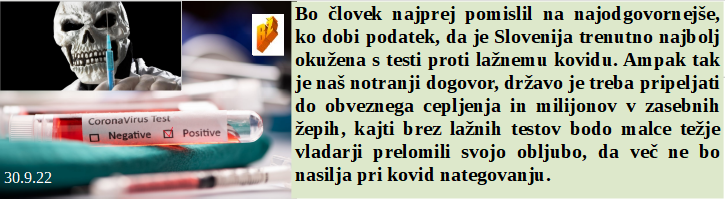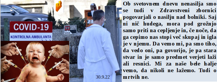 Očitno je še kar nekaj Slovencev, ki še imajo srce in sočutje. Svetovni dan nenasilja ali kako je možno, da te oblast ne cepi nasilno? Smo po testih najbolj okuženi, ampak saj še nimamo samo zasebneg zdravstva. Nas vedno zanima samo tisto najboljše depopulacijsko orožje. Proračuna za 23 in 24 drvita navzgor, brez denarja, ampak z Ukrajino.