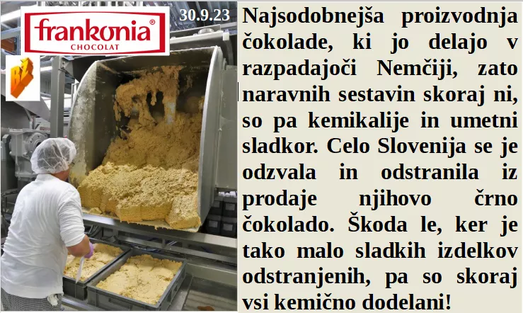 Malce bolj resno so začeli naši nadzirati zastrupljeno hrano. Nemška čokolada brez naravnih sestavin, kakšen užitek. In naši mediji že na polno hvalijo nova zelo škodljiva cepiva, predvsem za starejše. Kakšno naključje med Hovnikovo in upokojenci. In lažejo o raku, niti z besedo o povzročitelju 5G.