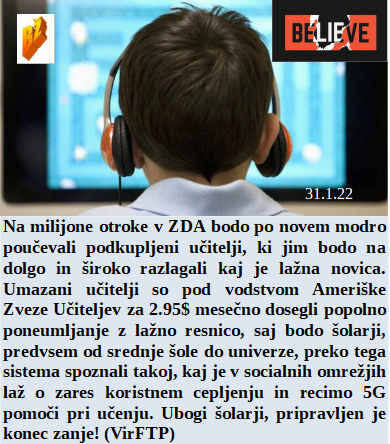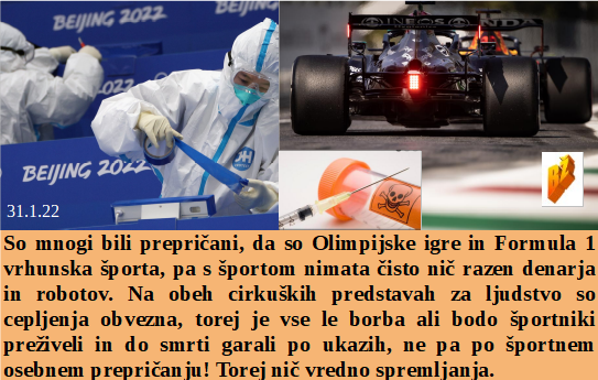 So danes dobili mnogi upokojenci tudi sanjskih 3€ dodatka k pokojnini, kar imajo oblastniki komaj za eno kavo v elitnem lokalu. Formula 1 in Olimpijske igre pa so ta trenutek najbolj medijsko odmeven kovid cepilni nateg. Bodo tudi Ameriški šolarji podučeni kaj je to lažna novica - torej nekaj daleč od resnice, ki pa bo zanje postala edina resnica.