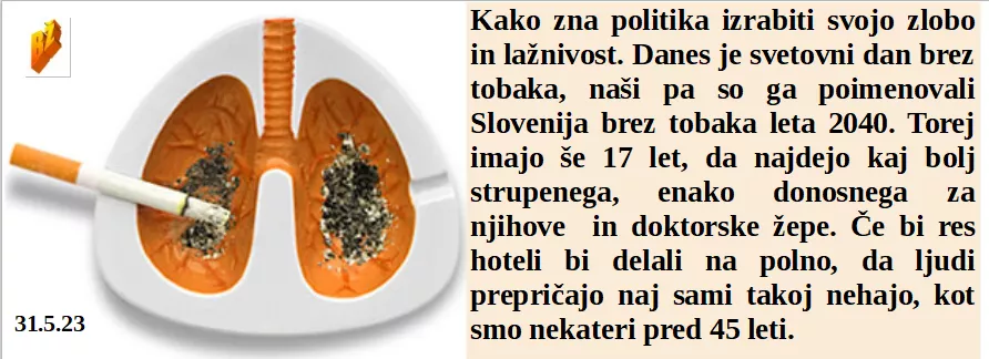 Na današnji dan leta 2040 bo tudi Slovenija imela dan brez tobaka. Eno leto je kar smo začeli voziti gluhi in slep narod, precej uspešno. Ko se namučijo po prehranjevanju se tudi golobi vozijo s falconi. Veš, RTV mora ostati Janezova, sicer bomo poslušali še druge strani laži, tudi brez resnice.
