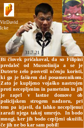 In Filipini povsem kopirajo nekdanjega fašističnega voditelja, žal v letu 2021. Covid pa je medtem banka za shranjevanje zaslužka od laži in cepiv. Da pride do tega mora elita vpeljati popoln strah, ta pa šele prinaša velike denarje. Gibraltar je še kako zanimiv za kakšno grofijo v celoti, zato so že cepili vse!