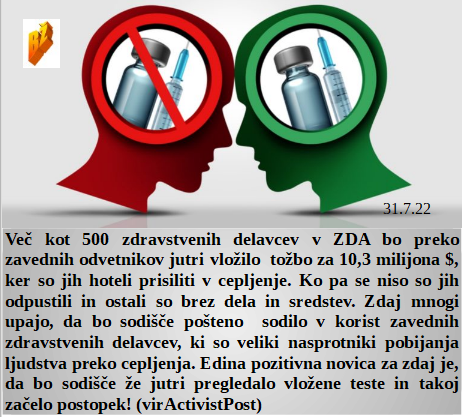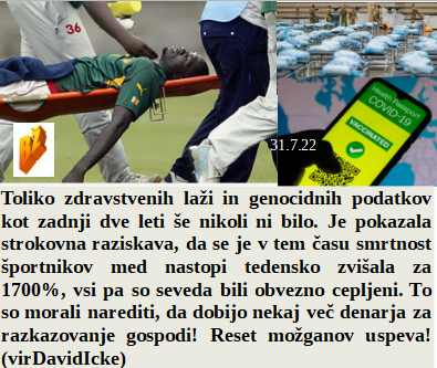 Začnimo se upirati odločno proti 5G, kot kmet v Franciji! V zadnjih dveh letih se je smrtnost športnikov med nastopi dvignila za 1700%! Midva pa res ne Putina ne Rusije ne marava. Od utrujenosti od nič dela je čas za počitnice. Več kot 500 Ameriških zdravnikov bo tožilo državo, ker so jih hoteli nasilno cepiti!