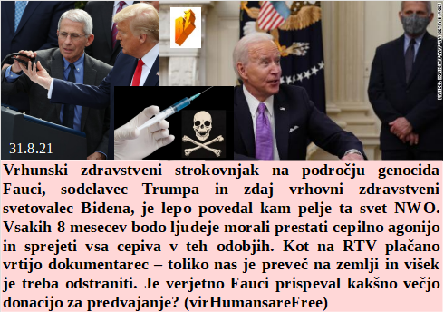 Otroci so naš jutri, kolikor elita to še dovoli, zato jih čuvajte in ne dovolite cepljenja. V ZDA zdravstveni delavci tožili državo Maine zaradi nasilnega cepljenja. Ker virusa ni smo morali včeraj mi okužiti nove ljudi. Bo vojaški kredit 780 milijonov izpolnil napoved o cepljenju do oktobra? Bomo na silo cepili vse nad 50 let. Zločinec stoletja je Fauci, tesen Bidenov in Trumpov sodelavec.