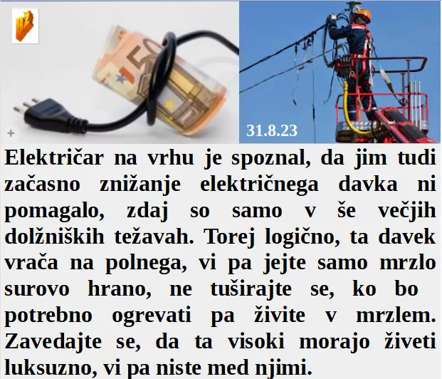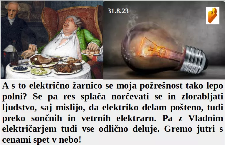 So medijske tipkovnice tako polne orožja proti resnici! Tudi, ko se je zmanjšal električni davek, požrešnost ni odnehala. In upokojenci bodo svojemu desnemu vodji verjele, da bo naslednji mesec dvojna pokojnina. Kako politika laže kadarkoli in ogabno! In nov jedilni list za elektro gospodarje bo res obilen!