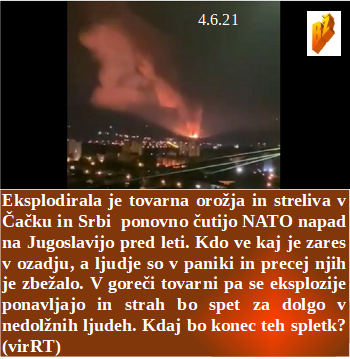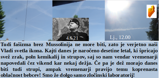 Če hočemo uspeti moramo verjeti drug drugemu in ne podtikati politike. Dan za nasiljem nad otroki, torej jih nasilno cepimo. So v Šabcu pogledali v NATO zgodovino. Pri nas pa je prišel Mussolini pokazat svoja letala. Bo novi pravosodni minister strokovnjak za razprodajo dežele? Z novimi vojaškimi štirikolesniki nad ljudstvo? Tam pa sem videl TAM, pa so ga zato uničili namenoma!