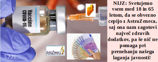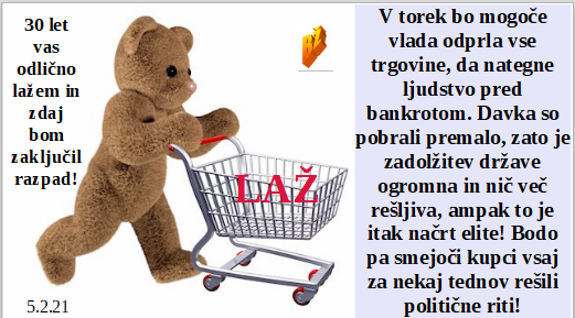 Nujno rabimo dotok denarja preko davkov, zato odpiramo nekaj trgovin. Bomo pa mnogo tega denarja namenili zadnjemu cepljenju starejših. Smo za te COVID bedarije kvalificirali tudi mlade, ki jim mediji nosijo vse pralne informacije. VB pa bo odprla vrata prostosti šele, ko bodo vsi nad 50 let cepljeni in jih ne bo več. Boj proti globalnemu segrevanju je zgolj eden od najhujših globalnih zločinov!