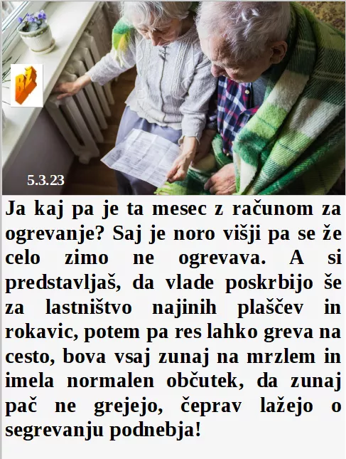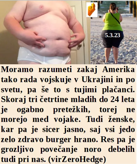 Če celo medijem uide, kako je pri nas vsak mesec hujša revščina, potem je nekaj prikrito zares narobe. Američani morajo vojno reklamirati v Ukrajini, imajo preveč mladih predebelih. Celo zimo sva bila na mrzlem pa imava tak račun za ogrevanje? Je treba najbolj revne dežele prenesti v žepe bogatih in to s tehnologijo in znanostjo goljufanja.