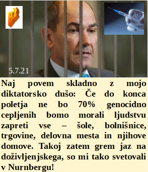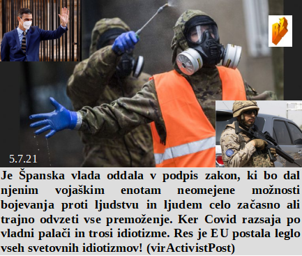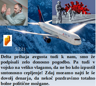 Špricanje na nebu kot v času koncentracijskih taborišč. Delta pa prihaja z najvišjo izmišljeno hitrostjo. Laganje o smrtih po cepljenju je več kot nečloveško. Po vrnitvi slovenskih mladih okuženih so Španci takoj uvedli vojaški nadzor nad takimi, ki so jim covid teste podtaknili. Do konca poletja imamo tudi pri nas 70% cepljenih ali pa vse zaprto. Tudi psihopati lahko dobijo vladne službe. In šef svetovnih zločincev že zahteva popolno cenzuro!
