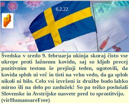 Pol tunela pod Slovenijo je že izkopanega in vsa polvica je tvoja. Ne bojte se držaje hrane, imam GSO za vas. So tvoji testi meni najprej pokazali kako dobro lažejo. 20 prehlajenih dojenčkov je bilo včeraj, torej mora oblast resno razmišljati, da jih cepi proti kovidu! Kljub drugačnim slovenskim nasvetom Švedi ukinjajo skoraj vse kovid norosti!