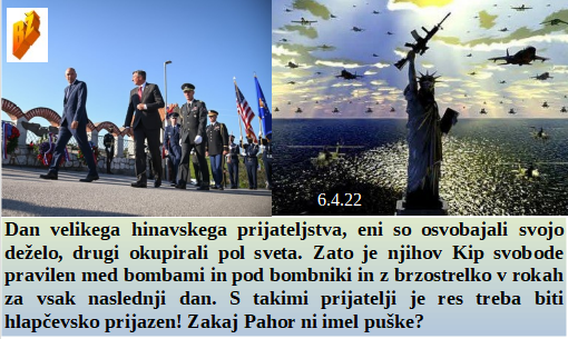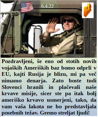 Imate Slovenci dovolj denarja zato boste naše vojaške baze na novo vzdrževali. Zdaj, ko se je kovid začel zmanjševati je vprašanje kaj vse si bo elita izmislila, da nadaljuje zločine? Samo osnovni stroški in kredit požrejo 40%, kaj vse pa še potem? Dan velikega prijateljstva, kje jim bomo mi pomagali pri svetovnih zločinih!