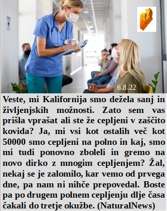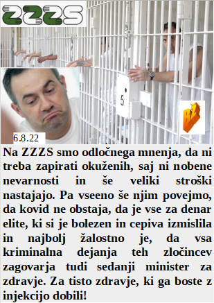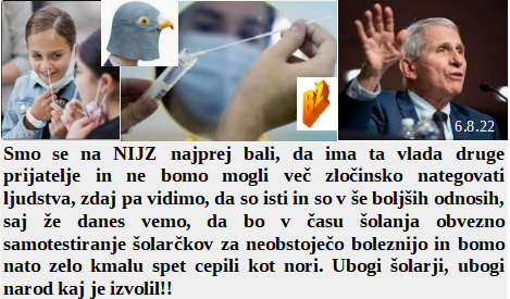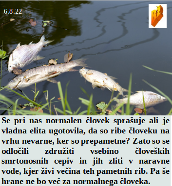 Cilj sedanjih zločincev je zgolj preživetje zločincev. Le kaj bodo ribe delale v naših vodah, saj še človeku niso namenjene. Na NIJZ smo si zelo oddahnili, saj ima ta vlada iste prijatelje. Bodo Kijevski slovenski hoteli zdaj samevali daleč na severu. Tudi sedanji zdravstveni minister zagovarja nedolžno smrtonosno cepljenje. Nas je ogromno na polno cepljenih in zdaj ponovno zboleli ponovno na isto dirko!