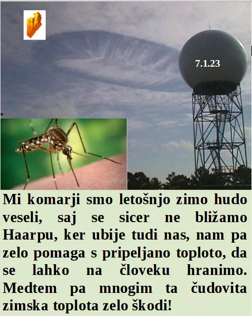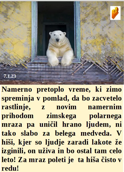 Tragi komedija z lažnim podnebjem je pa mogoče koristna za belega medveda? So Štajerci danes uživali v slikarskih umetnijah, Ljubljančani pa smo imeli že odvržene barve. Komarji uživamo ob tako topli zimi, saj lahko v živo pijemo človeško kri. So na Japonskem odobrili novo Pfizer cepivo in smrtnost se je zelo hitro povečala za 400%. Terorist WHO je povedal, da so vsi anti cepilci teroristi.