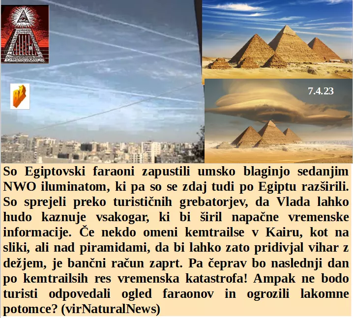 Danes je še kako pomembno ločiti GSO in zdravo hrano, zato je treba o tem zelo paziti. Francoski upokojenci so mnogo glasnejši od naših, pa imajo celo več kot naši. Piramide so danes simbol zla, Egipt pa z njimi turistično služi. Če hočejo najbogatejši zdravo živeti morajo ostalemu svetu vzeti vse.