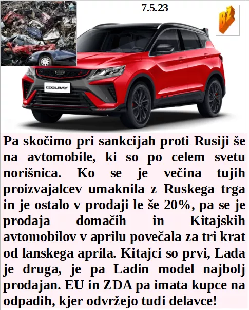 So ego zaljubljenci tekli v London na kronanje, da jih svet vidi. In Rusija zaradi sankcij lahko nafto prodaja celemu svetu. In prav zaradi sankcij je avtomobilska industrija izgubila trg v Rusiji. V pijačah, ki jih delajo v tovarnah, so same toksične snovi, da zares škodijo nevednim pivcem.